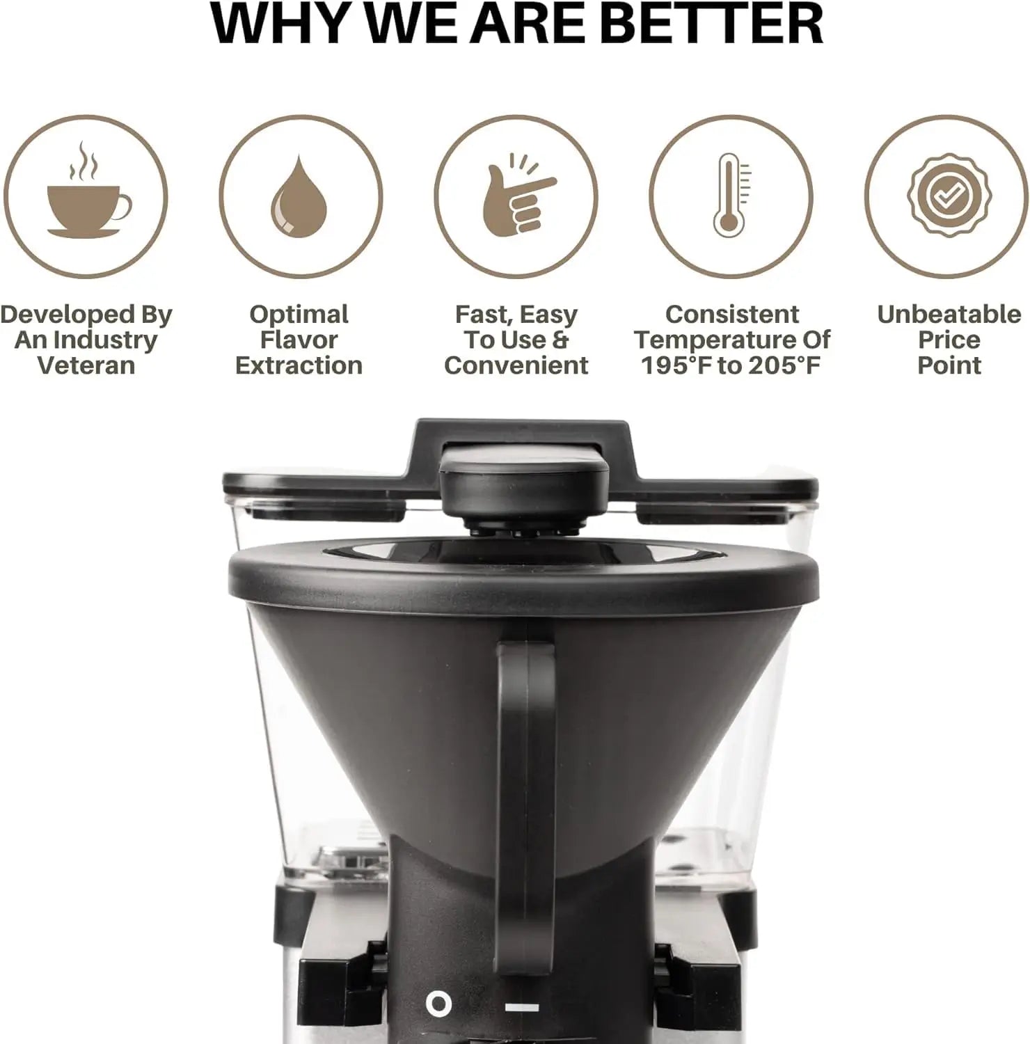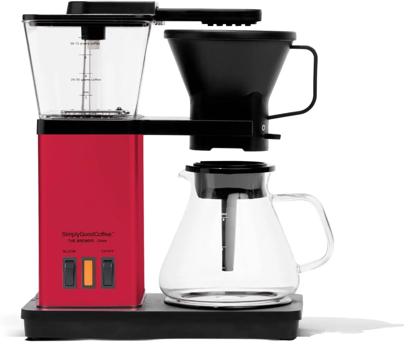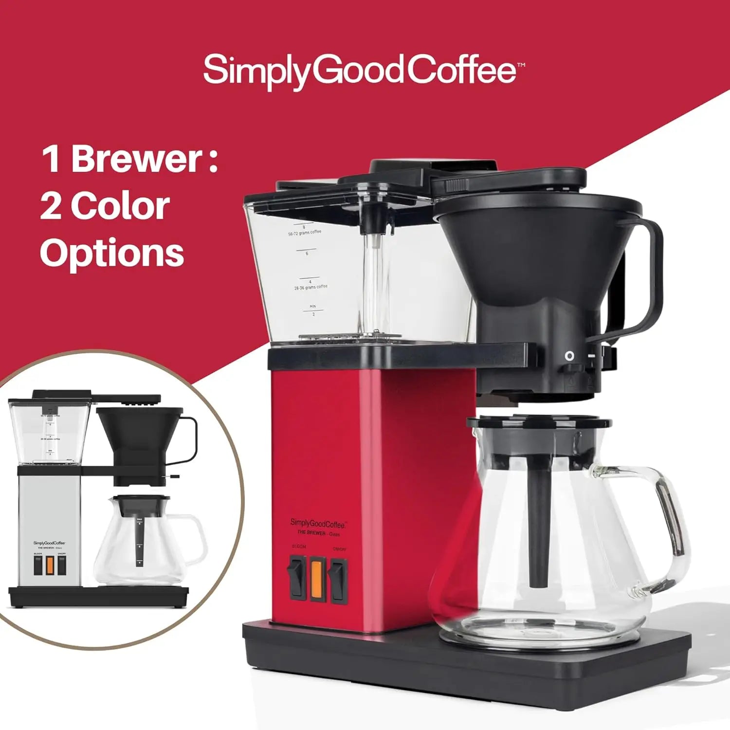 The brewer is stainless steel silver and black at the base and comes with a custom DIY vinyl wrap to elevate your coffee machine and turn it into a matte red brewer in just a few simple steps. This brewer uses a quick heating element that consistently delivers 195°F to 205°F water. The wide showerhead and Bloom function work with the correct water pressure, drip distance and #4 filter shape to create even saturation. It is designed to deliver on flavor. The approx. 6-minute brew cycle will produce optimal extraction