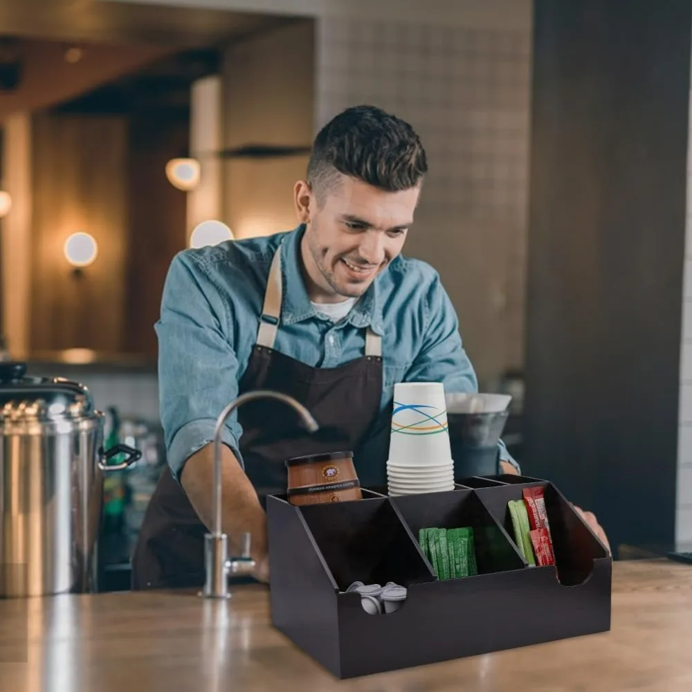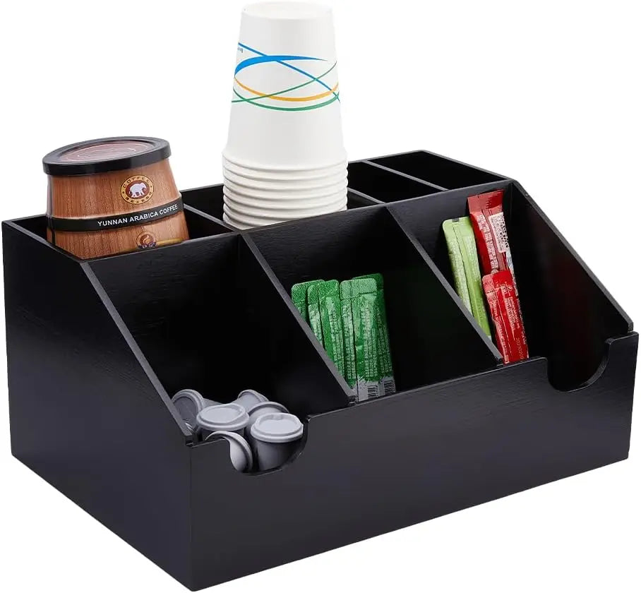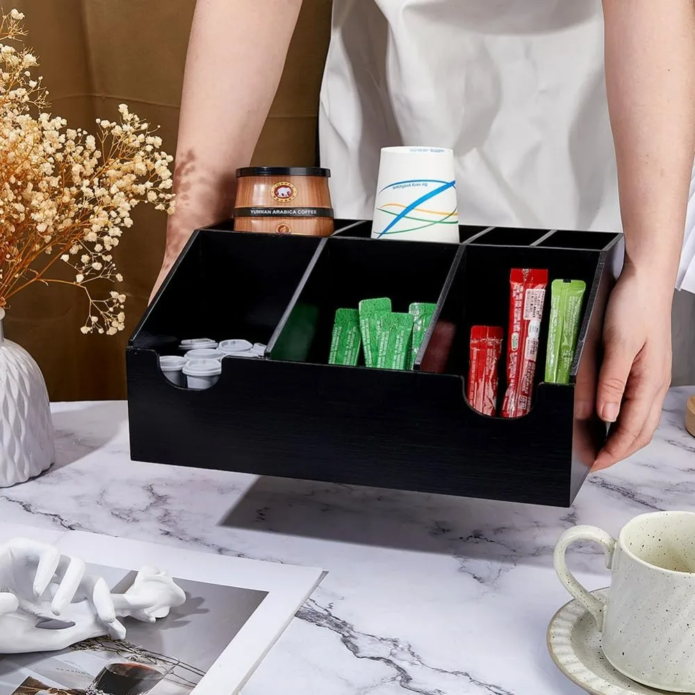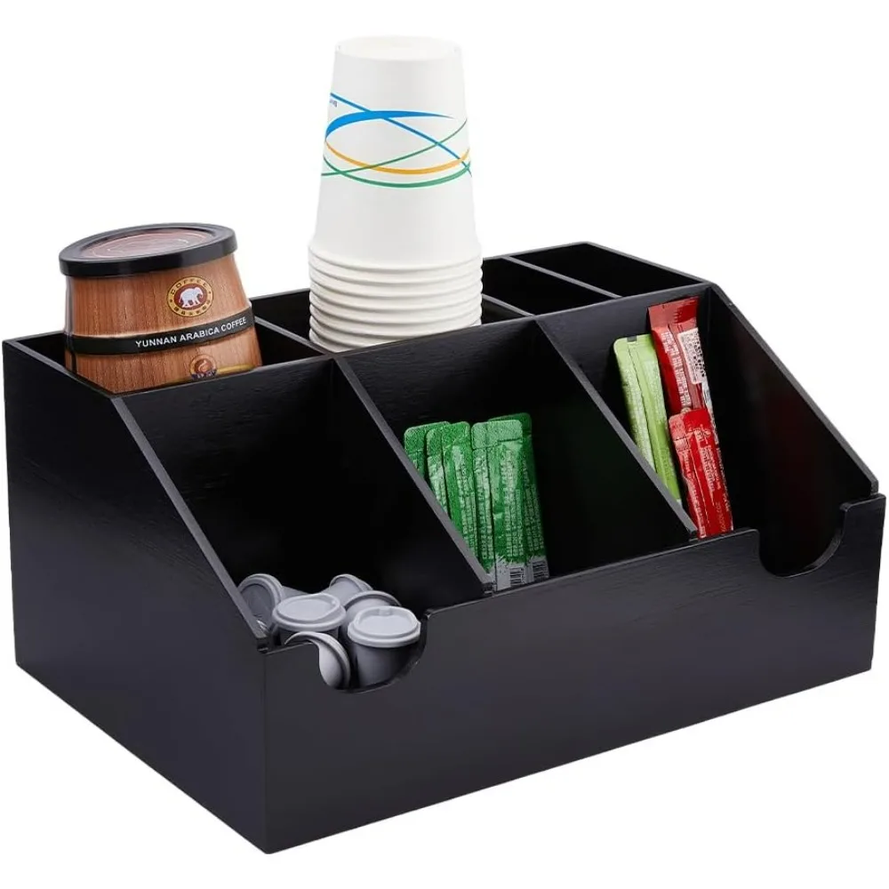 Coffee Station Organizer:This wood caddy features multiple compartments to neatly store coffee pods, tea bags, syrup cups, and condiments in one convenient place.