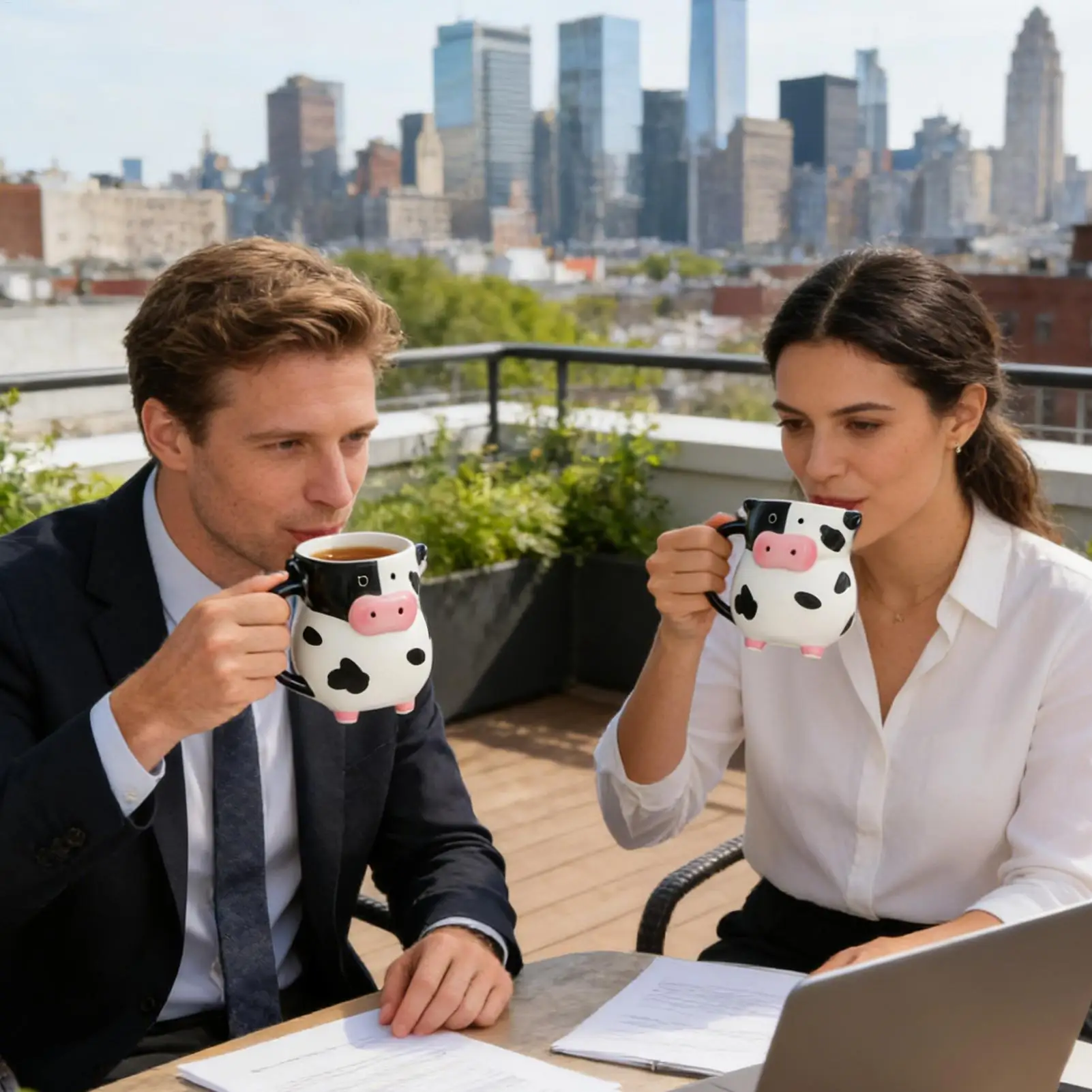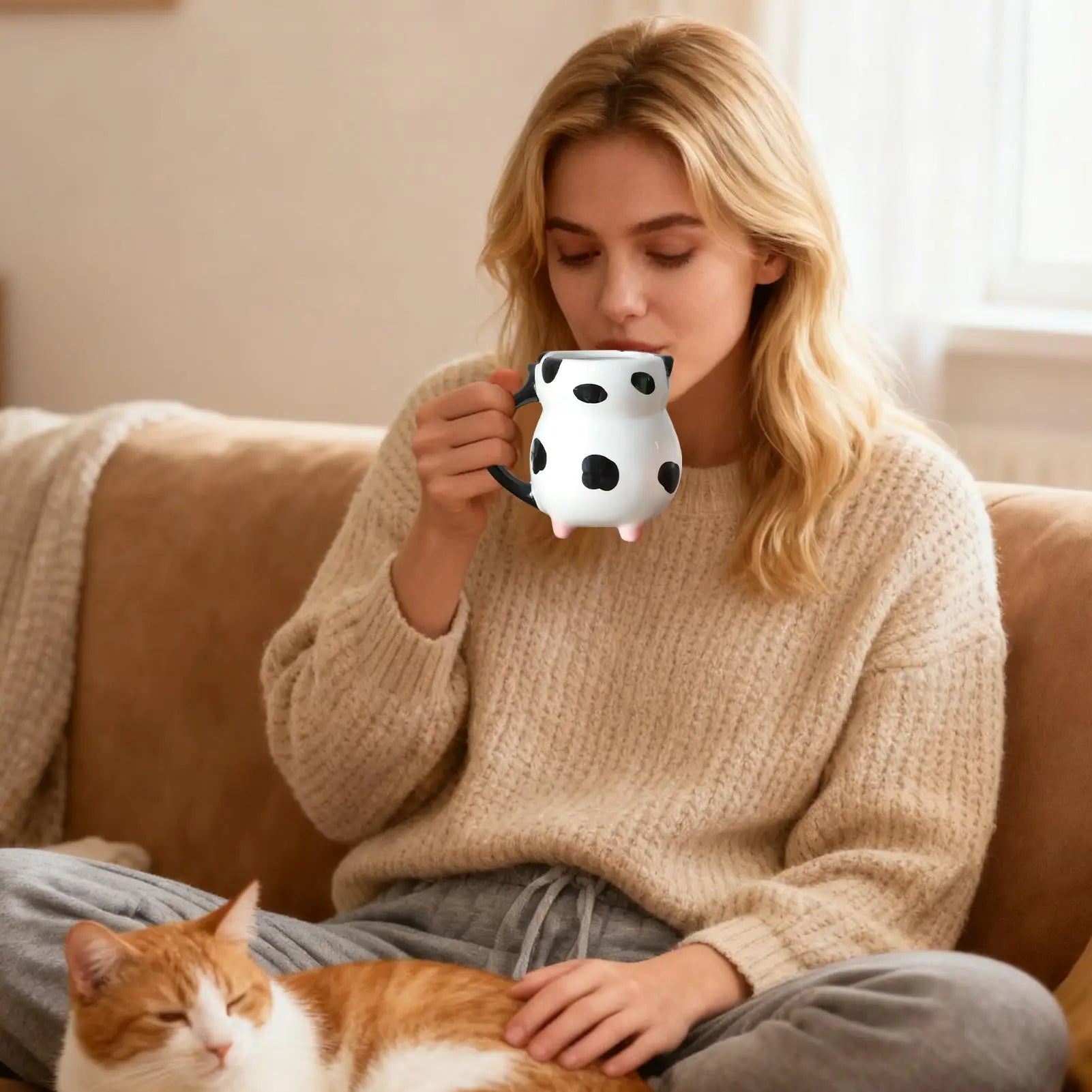 1.Charming Cow Cup Feature: With its three-dimensional cow head and eye-catching black-and-white spotted texture, the cow cup fosters fun interactive moments, enhancing daily life by brightening spaces while serving as a delightful healing little pet for moments of comfort during tea time or innovative brainstorming sessions